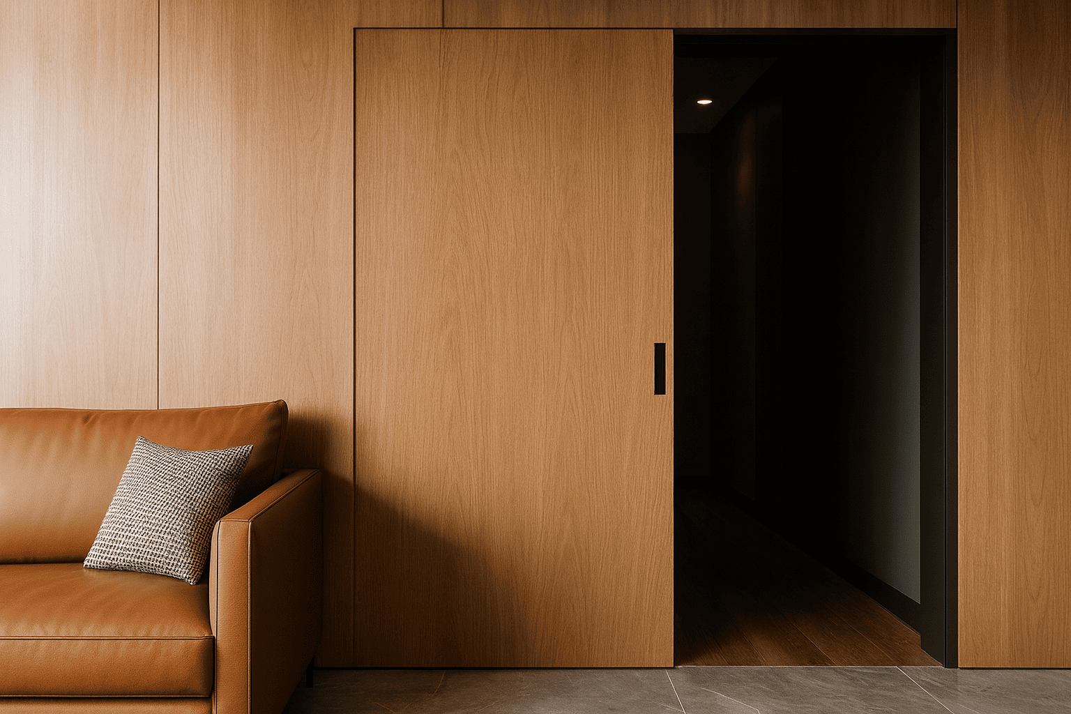 Дверь-призрак — это, по сути, раздвижная система, спроектированная так, чтобы быть невидимой или «спрятанной на виду». Вся фурнитура — рельсы, ролики и направляющие — искусно скрыта либо внутри дверной панели, либо за прилегающей стеной, создавая иллюзию парящей двери без видимой опоры. На практике дверь плавно скользит по скрытому от глаз рельсу , так что вы видите только саму подвижную панель. Именно поэтому её часто называют «призрачной» или волшебной дверью — кажется, что панель движется сама по себе, без видимых направляющих.